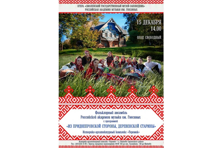 В рамках презентации коллективом Музыкально-этнографического центра имени Е.В. Гиппиуса Российской академии музыки имени Гнесиных новых изданий – три DVD-диска к I, II и III томам «Смоленского музыкально-этнографического сборника» состоится выступление Фольклорно-этнографического ансамбля Российской академии музыки имени Гнесиных (Москва).