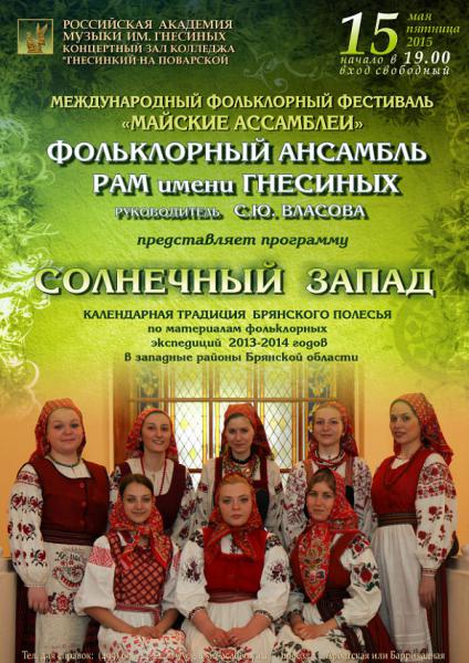 Программа фольклорного ансамбля РАМ им. Гнесиных «СОЛНЕЧНЫЙ ЗАПАД» посвящена одному из уникальных пластов славянской музыкальной традиции — фольклору западных районов Брянской области. Этот регион является частью особой историко-культурной территории древнего расселения восточнославянских племен – Восточного Полесья, и связан единой этнографической основой с традициями соседних белорусских (гомельских) и украинских (черниговских) территорий. Главная отличительная черта фольклорной культуры Восточного Полесья — доминирование календарно-обрядовых жанров, охватывающих годовой круг крестьянских праздников и полевых работ и указывающих на первоистоки музыкального мира наших предков.