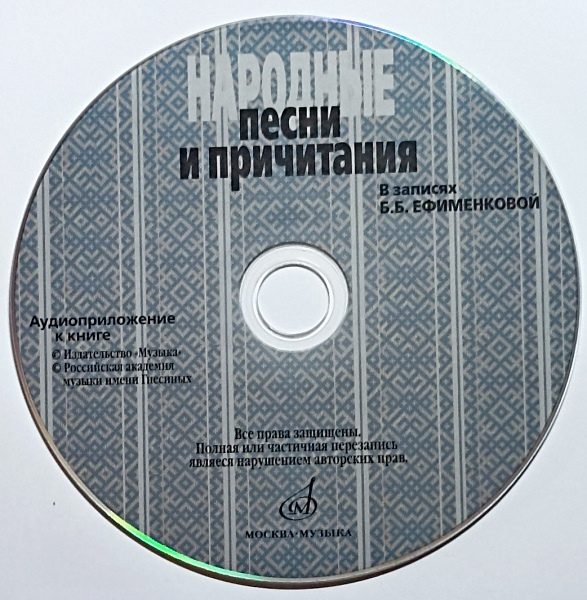 Сборник дополняет звуковое приложение на цифровом компакт-диске, где помещены 40 образцов севернорусских народных песен и плачей, записанных Б. Б. Ефименковой.