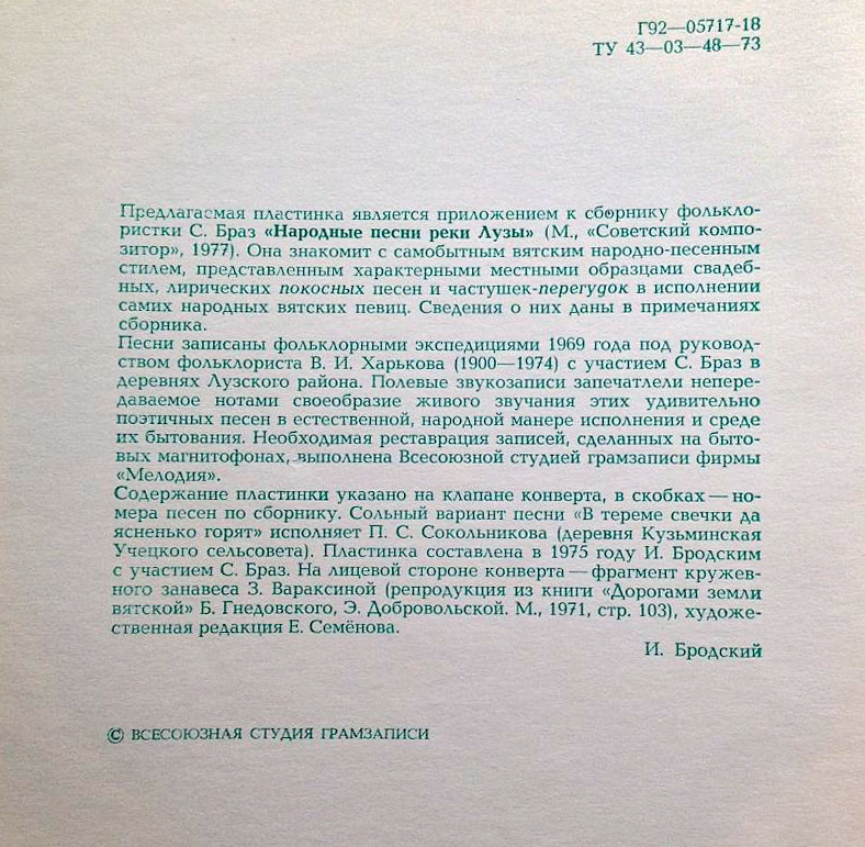 Общая же близость песенного стиля Лузского района к северному подтверждается как характером интонационно-мелодического развития напевов, так и сходством их с опубликованными песнями Поморья, Пинежья, Мезени и текстовыми перекличками со сборниками А. Соболевского.