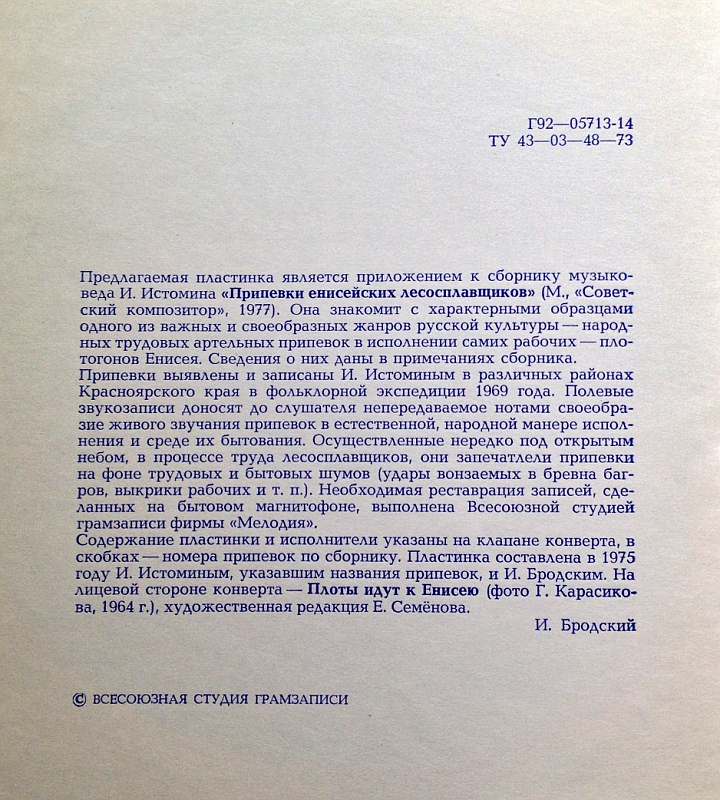 Наша поездка 1969 года на Енисей, давшая материал для настоящего сборника, не была случайной. Мы знали, что у нижнеенисейских сплавщиков бытуют трудовые припевки, так как на Ангаре в 1964 году были записаны их одноголосные варианты.